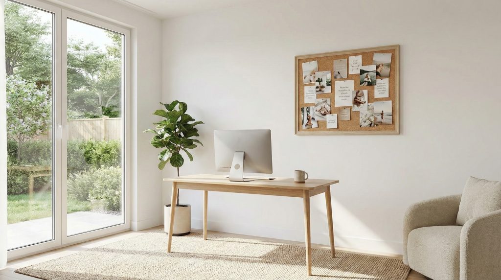 Image Prompt:Concept art 16:9. A peaceful bedroom at dawn, 5:30 AM. Soft blueish morning light coming through the window. An alarm clock on a desk far from the bed shows ’05:30′. The bed is neatly made (implying the person has risen). A glass of water sits on the nightstand. Minimalist and inspiring atmosphere.