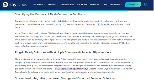 Ví dụ: CTG Federal đã thay thế nhiều nhà cung cấp nhỏ lẻ bằng một đối tác duy nhất là Shyft Global Services để đơn giản hóa quy trình và giảm chi phí.